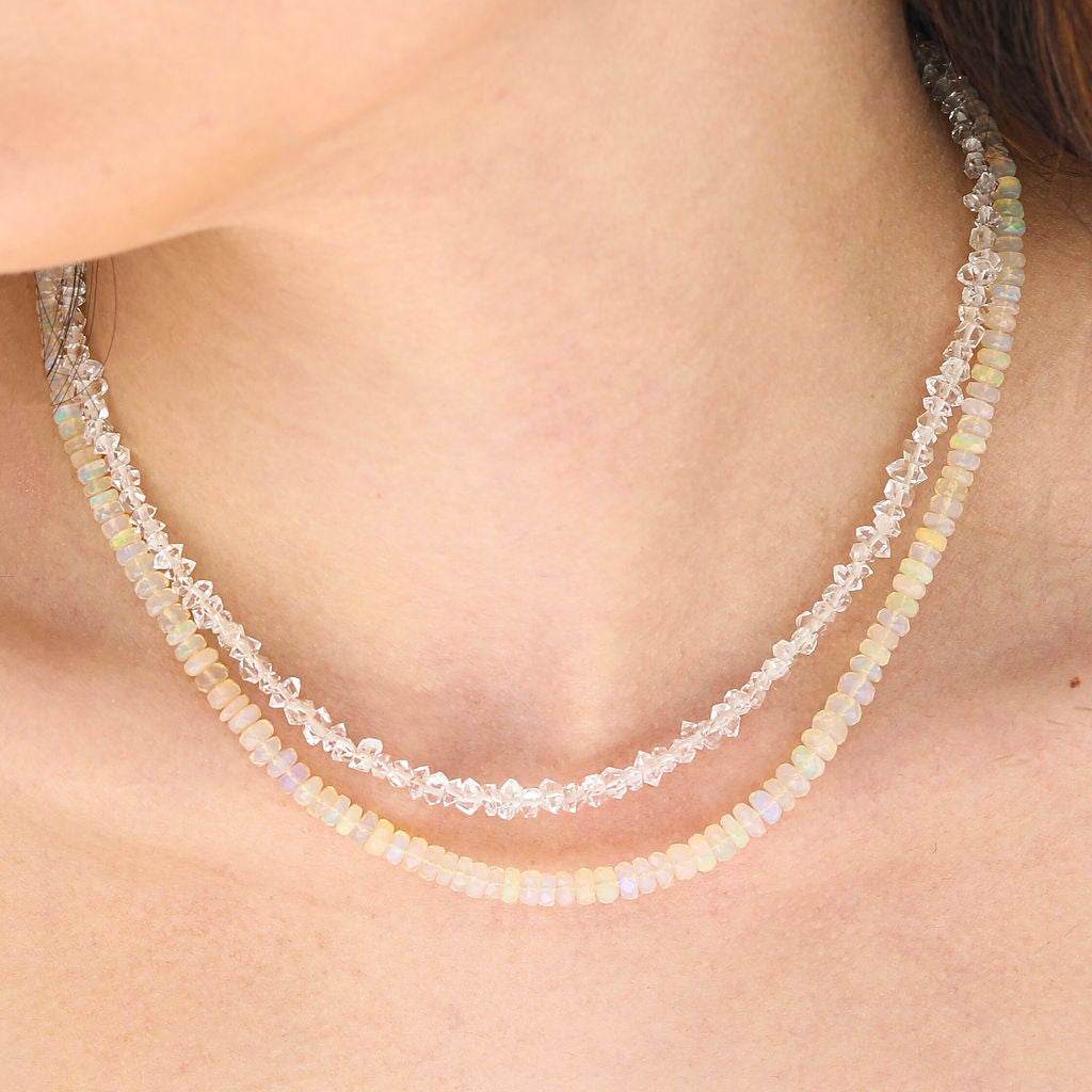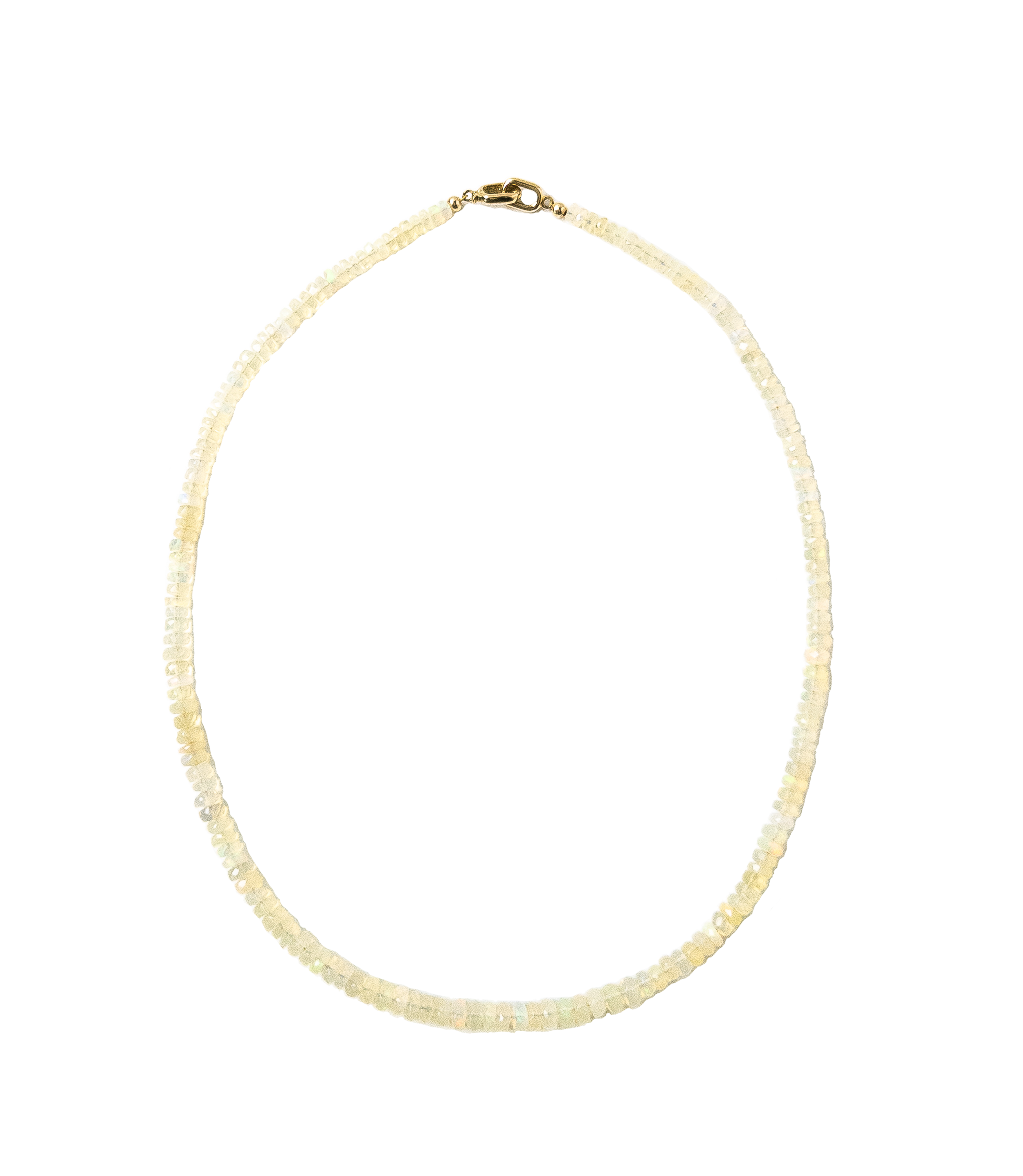 Discover the uniqueness of our Champagne Faceted Opal Necklace! Each opal is individually crafted, making every piece one-of-a-kind. Watch as the champagne opals glisten in the sunlight, showcasing a stunning array of colors, from red and green to blue and orange. This necklace features 4-7mm Ethiopian opal beads and a 14K yellow gold 19.2mm oval hinged hook and eye clasp. Experience the beauty of nature with this exquisite necklace.